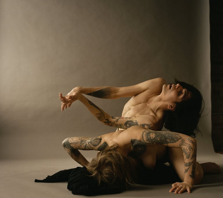 Garden of Ruins is a butoh duet grounded in eco-somatics and sapphic intimacy as a perceptive, eternal, glistening web. Connected to systems of rebirth, two infinite bodies build, merge, float, and dissipate as they journey to an unspoken world and return to soil.